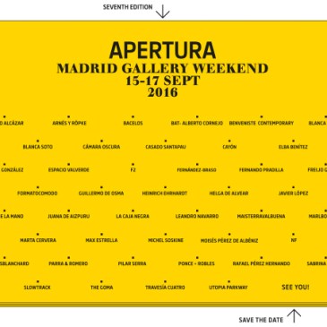 Medio centenar de galerías madrileñas abren juntas la temporada MasdeArte.com Madrid, 14/08/2017 APERTURA MADRID GALLERY WEEKEND 2017 ya tiene fechas: se celebrará entre el 14 y el 16 de septiembre, un fin de semana en el que medio centenar de galerías de la capital volverán a ofrecer al público exposiciones y horarios especiales, visitas privadas … More Madrid Gallery Weekend: todo listo para lanzar la temporada con Palazuelo, Vik Muniz, Maruja Mallo y Guillermo Mora