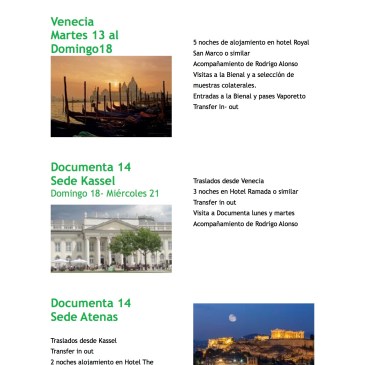 Los invitamos el próximo Martes 26 de Septiembre de 2017 a una charla informativa sobre nuestros proximos viajes a los siguientes eventos culturales: VISITA a 57 BIENAL VENECIA VIAJE INHOTIM + Escena de arte en Sao Paulo NEW YORK: TEMPORADA SUBASTAS Miami ART BASEL + Ferias de ARTE. La reunion tendra lugar en la nueva … More Se presentan el martes 26 los viajes programados por Jula para el resto del año!